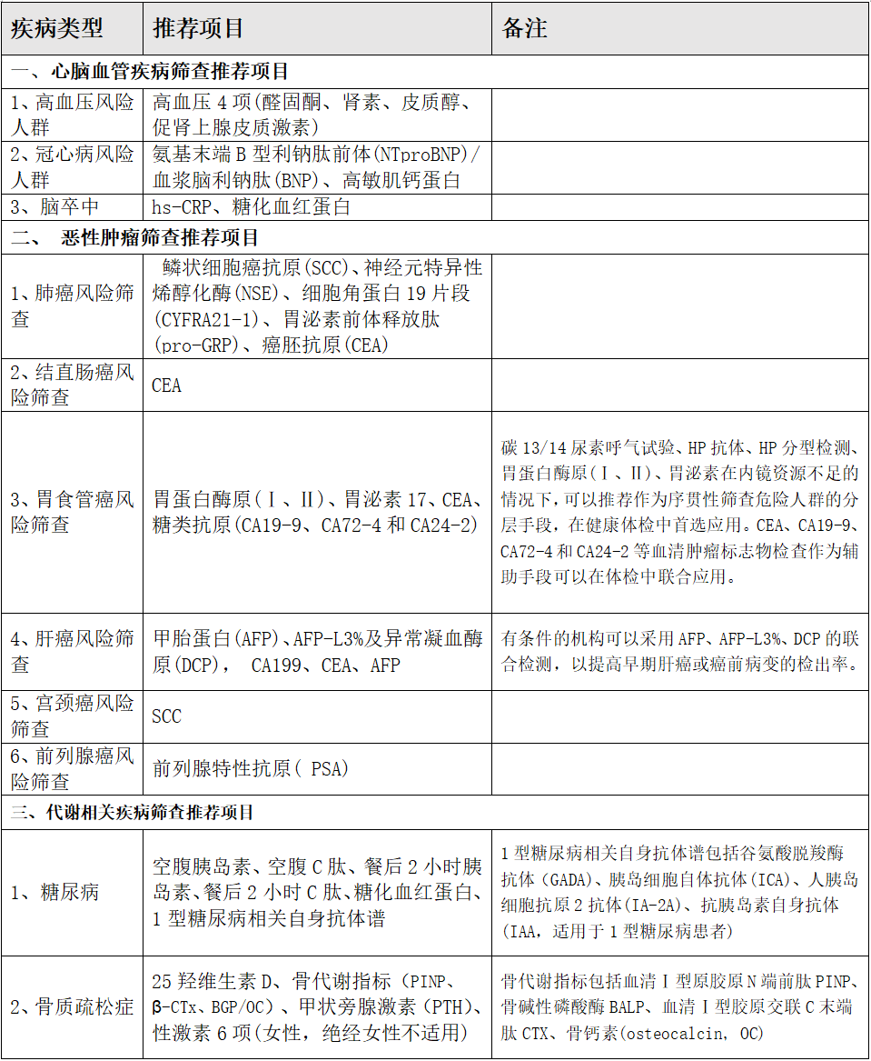 《健康體檢與管理》雜志編委會聯(lián)合北京醫(yī)學會健康管理學分會等學術組織,匯聚了全國健康體檢與管理機構80余位知名專家的意見建議,制定了成人個體化健康體檢基本項目和常見慢性病篩查體檢項目的推薦清單,形成《成人個體化健康體檢項目推薦專家共識》,已于近期發(fā)布。針對常見病和慢性病的健康體檢項目推薦清單,熱景生物多個項目獲得推薦(表1)。