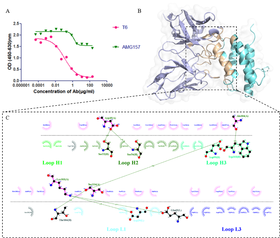 圖1:TSLP-T6復合物結(jié)構(gòu)分析。(A) ELISA實驗測定AMG157與T6抗體的結(jié)合表位;(B) TSLP-T6復合物結(jié)構(gòu);(C) TSLP-T6作用力分析