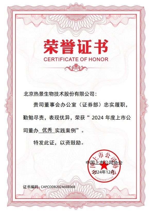 近日,中國(guó)上市公司協(xié)會(huì)開(kāi)展的“上市公司董辦最佳實(shí)踐案例征集活動(dòng)”結(jié)果揭曉,熱景生物榮獲“2024年度上市公司董辦優(yōu)秀實(shí)踐案例”,這也是公司連續(xù)第三年獲此榮譽(yù)。 “上市公司董辦最佳實(shí)踐”案例征集活動(dòng)是中國(guó)上市公司協(xié)會(huì)對(duì)上市公司董事會(huì)辦公室履職情況進(jìn)行評(píng)價(jià),評(píng)價(jià)體系涵蓋了上市公司董辦工作所涉及的信息披露管理事務(wù)、公司治理機(jī)制建設(shè)、投資者關(guān)系管理事務(wù)等指標(biāo),于今年10月啟動(dòng),經(jīng)初審、專(zhuān)家委員會(huì)評(píng)審、誠(chéng)信核查等環(huán)節(jié),最終評(píng)出最佳實(shí)踐案例280家、優(yōu)秀實(shí)踐案例300家。其中入選“董辦優(yōu)秀實(shí)踐案例”的300家上市公司中,滬市上市公司150家,占50%;深市上市公司146家,占48.7%;北交所上市公司4家。