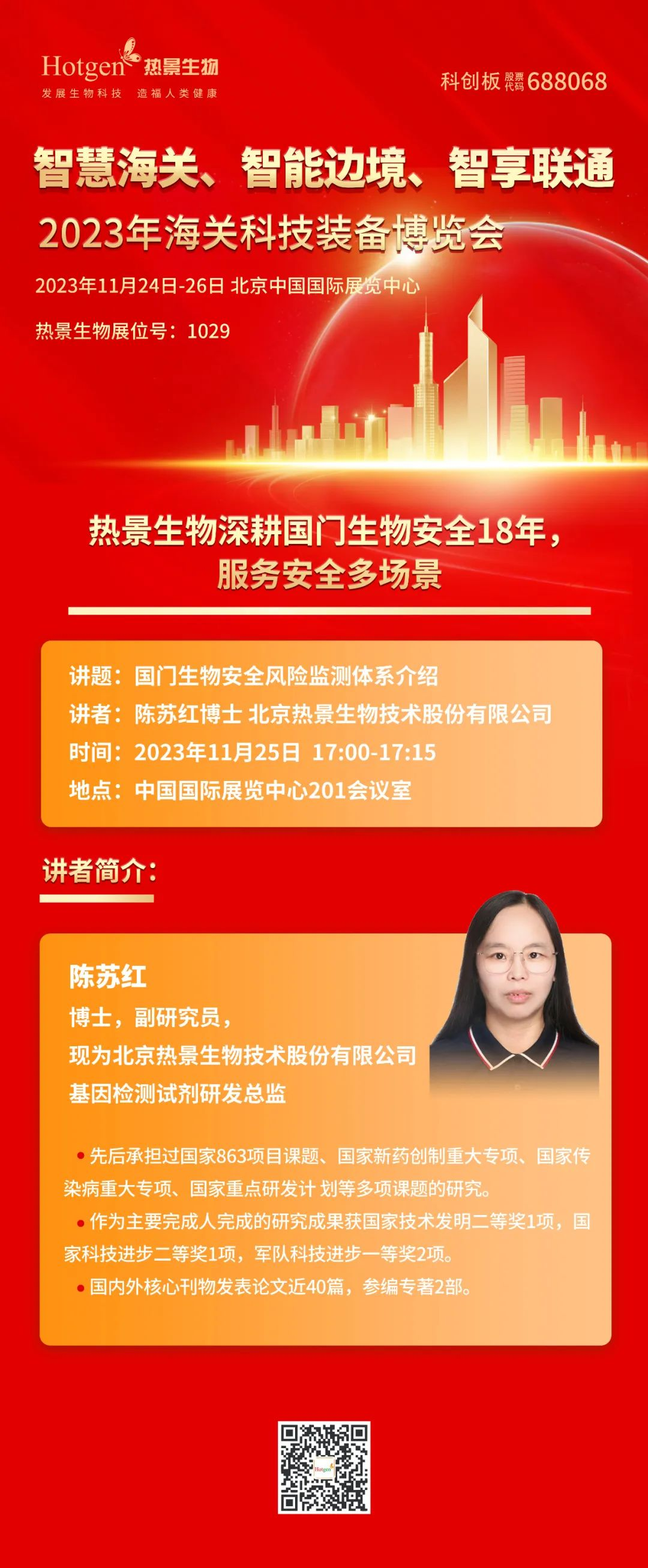 作為醫(yī)學與公共安全檢測領域先進制造商,熱景生物擁有服務公衛(wèi)安全多場景解決方案和專業(yè)經驗,相關產品廣泛應用于海關檢疫、生物安全、食品安全、疾控應急、糧食飼料工業(yè)、藥物濫用等領域。本次關博會,熱景生物將攜國門生物安全整體解決方案亮相大會,并做大會演講,歡迎蒞臨交流。