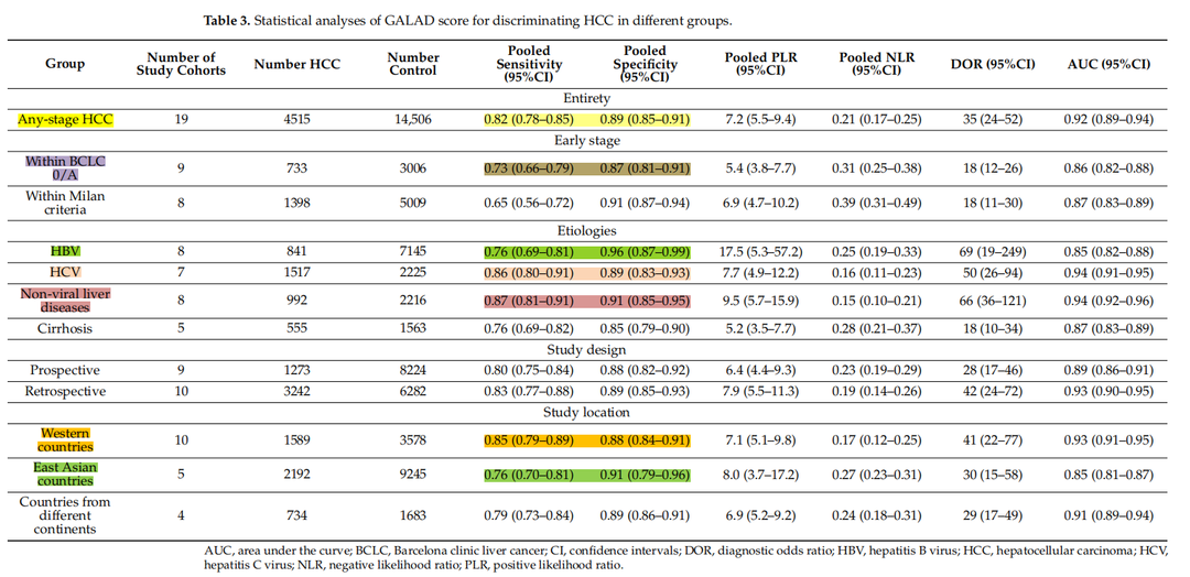 對于識別巴塞羅那臨床肝癌分期(BCLC)0/A期HCC,GALAD模型表現(xiàn)出良好的診斷準確性,敏感度為0.73,特異性為0.87。針對不同病因引發(fā)的肝癌,GALAD模型在乙肝、丙肝及非病毒性肝病相關(guān)的肝癌檢測中,其敏感度依次為0.76、0.86和0.87,特異性則為0.96、0.89和0.91。