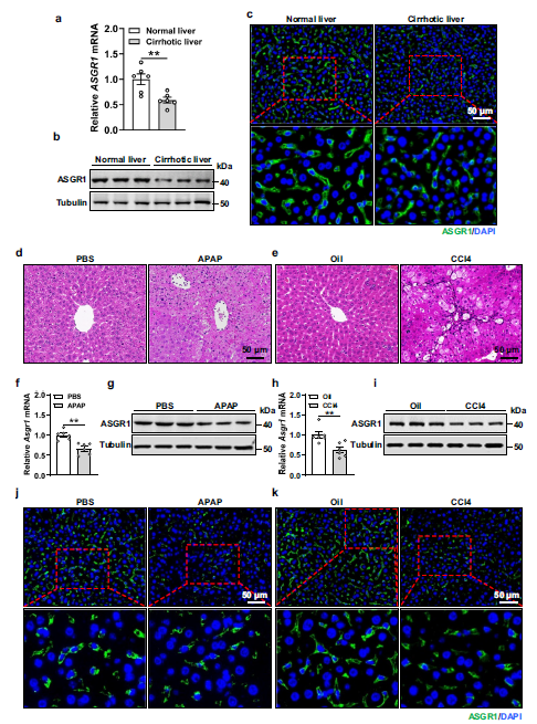 a、b 正常和肝硬化人肝組織中脫唾液酸糖蛋白受體 1 (ASGR1) 的相對 mRNA 和蛋白表達(dá)(每組 n = 6)。c 正常和肝硬化人肝組織中 ASGR1 的免疫熒光染色。d – k 8周齡小鼠腹腔注射對乙酰氨基酚(APAP,400 mg/kg體重,單劑量)以誘導(dǎo)急性肝損傷,PBS作為對照治療,或四氯化碳(CCl4,1 ml/kg)身體體重,每周兩次,持續(xù) 6 周),以油作為對照治療誘導(dǎo)慢性肝損傷(每組 n = 6)。d、e 肝切片的 H&E 染色。f – i 用 APAP 或 CCl4 處理的小鼠中肝臟 ASGR1 的相對 mRNA 和蛋白質(zhì)表達(dá)。j、k 用 APAP 或 CCl4 處理的小鼠肝臟中ASGR1 的代表性免疫熒光染色。