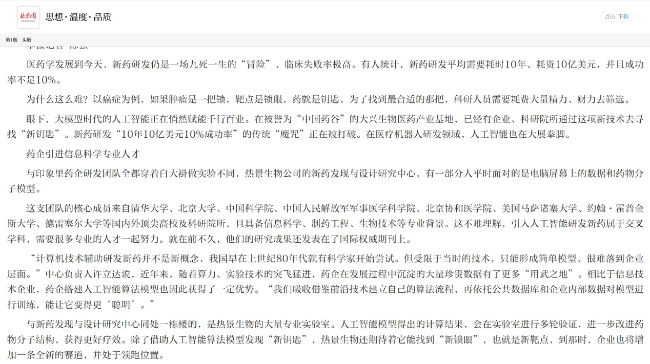 近期,人民日報、新華社、經(jīng)濟日報、中國外文局、北京日報等多家媒體先后走訪熱景生物,通過報道國際先進創(chuàng)新抗體藥物研發(fā)前行者——舜景醫(yī)藥、X-Gen AI新藥發(fā)現(xiàn)與設(shè)計研究中心最新研發(fā)管線進展、學(xué)術(shù)成果等實踐案例,進一步揭開AI加速FIC抗體藥物研發(fā)神秘面紗,探索人工智能技術(shù)如何打破藥物研發(fā)“雙十定律”。
