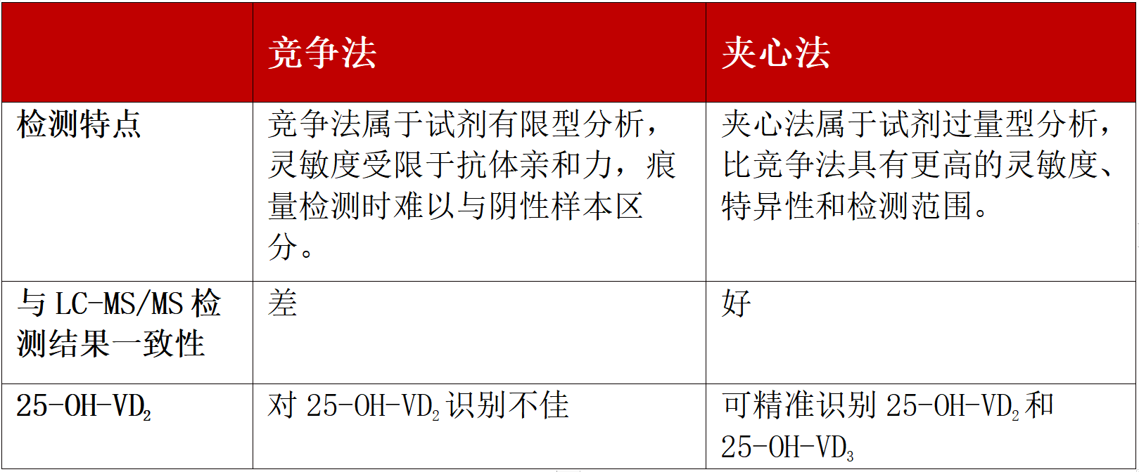 表:25-OH-VD檢測(cè)夾心法與競(jìng)爭(zhēng)法的對(duì)比
