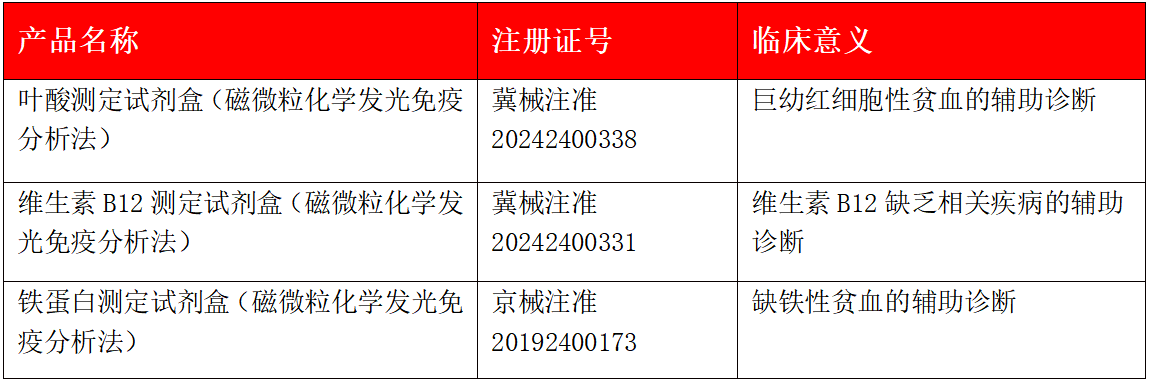近日,熱景生物研發(fā)的葉酸測定試劑盒(磁微?;瘜W發(fā)光免疫分析法)、維生素B12測定試劑盒(磁微?;瘜W發(fā)光免疫分析法),獲得河北省藥品監(jiān)督管理局批準的醫(yī)療器械注冊證。至此,熱景生物貧血三項(FA、VB12和Ferr)全部獲得注冊證,見表1。
