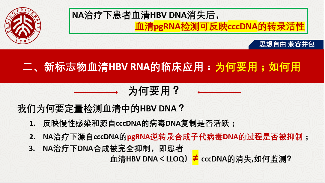 關(guān)于HBV RBA病毒樣顆粒的發(fā)現(xiàn)、血清HBV RNA的產(chǎn)生路徑、存在形式、來(lái)源和特點(diǎn)等做了詳細(xì)闡述,同時(shí)分享國(guó)內(nèi)肝病領(lǐng)域張文宏研究團(tuán)隊(duì)等工作成果,血清HBV RNA水平反映肝內(nèi)cccDNA的轉(zhuǎn)錄活性,血清 HBV pgRNA,是NA治療下HBV DNA < LLOQ后,能夠反映患者肝組織內(nèi)是否有cccDNA活躍轉(zhuǎn)錄的唯一指標(biāo)。