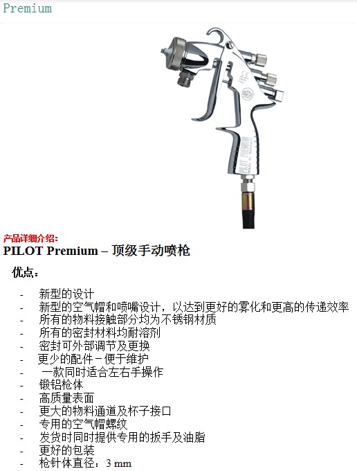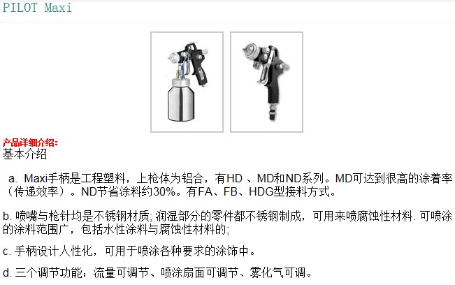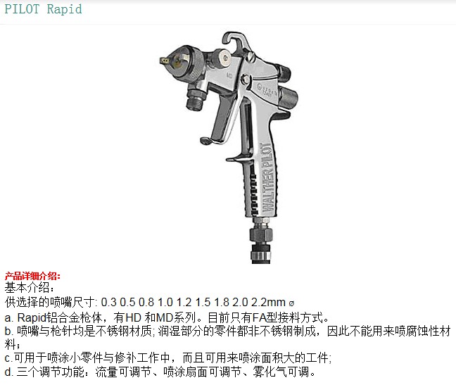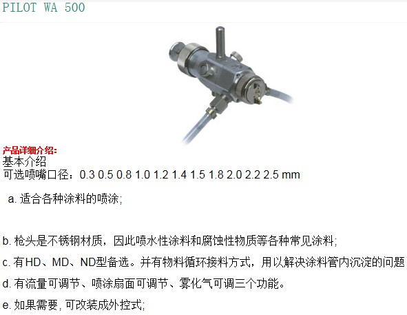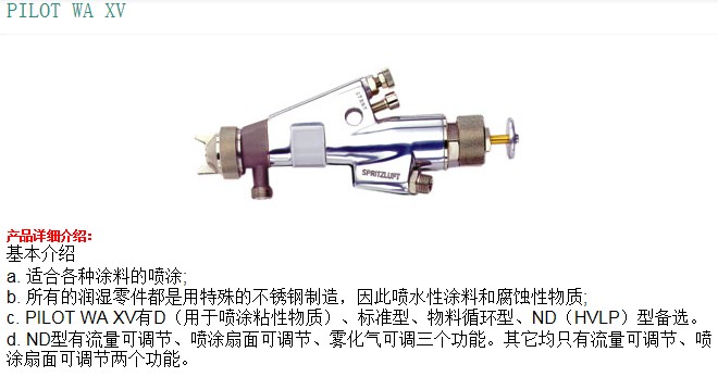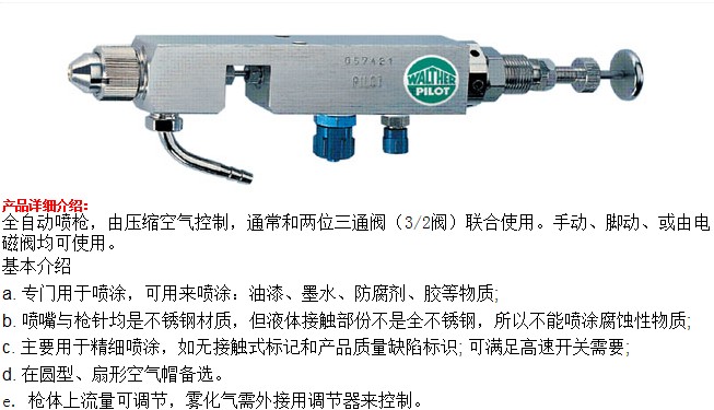 Walther Pilot產(chǎn)品代表了*的質(zhì)量——從簡單的噴槍到整個的噴涂系統(tǒng),均有完整可靠的解決方案。產(chǎn)品包含自動、手動噴